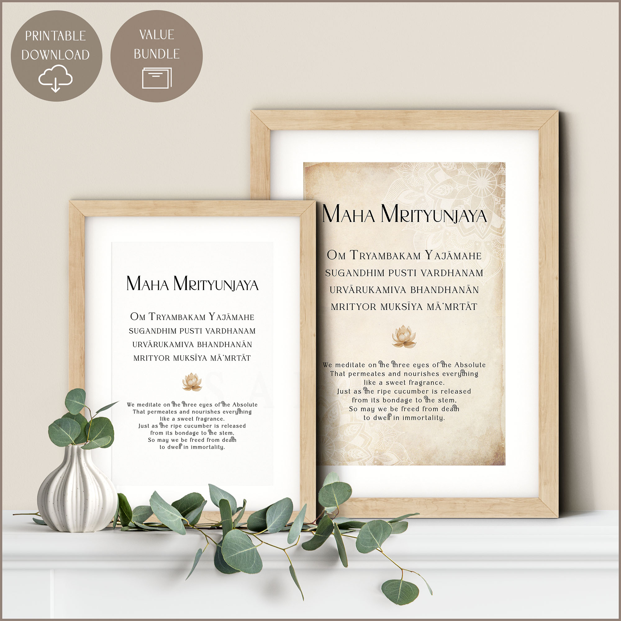 Honour the healing and protective energy of the Maha Mrityunjaya Mantra (also known as the Tryambakam Mantra) with this beautifully designed art print. Featuring the powerful Sanskrit chant alongside its English translation, this product includes two designs: one with a rustic background for a warm, earthy feel, and one with no background for a clean, versatile look. Perfect for yoga studios, meditation spaces or as a meaningful gift.