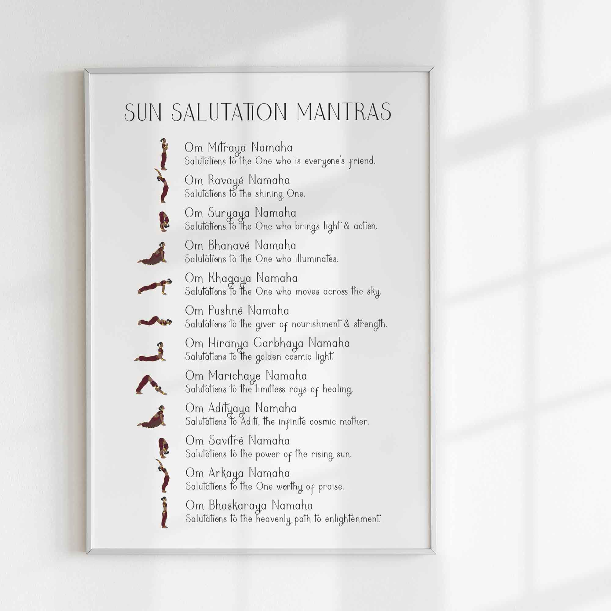 Celebrate the sacred flow of Surya Namaskar with this art print featuring the Sun Salutation mantras paired with graceful illustrations. Designed to inspire your yoga and meditation practice, it comes with two designs: one with a rustic background, and one without any background. Perfect for home practice spaces, studios or as a thoughtful gift for yoga practitioners.